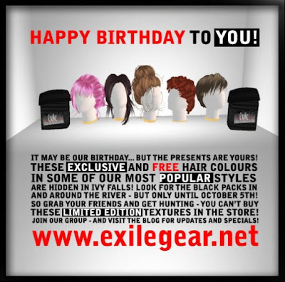 está festejando su primer aniversario con una cacería. Cajas de color negro, que contienen algunos colores de sus mas polpulares estilos de cabellos, están escondidas en Ivy Falls hasta el 5 de octubre....
