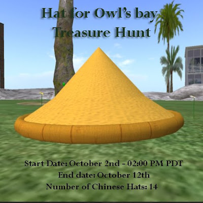Como celebración de la inaguración de Owl's Bay se realizará una cacería. Deberán encontrar 14 sombreros que están escondidos por todo el sim y que contienen regalos, algunos de ellos originales...