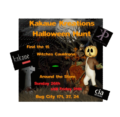 Encuentren las 15 calderos de bruja que se encuentran escondidos en la tienda y que contienen regalos de Kakaue Kreations, CIA y Shapes by Kira.