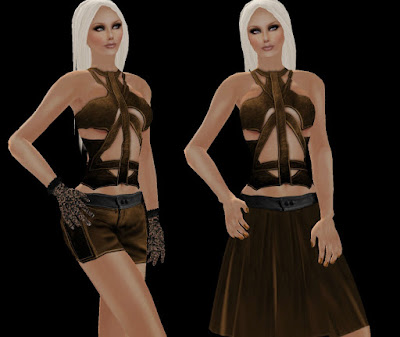 Valeska es la segunda de las creaciones. Un traje muy versátil en color dorado, con detalles en cuero negro, que puede usarse con falda o con shorts. Incluye manicura y guantes. Está disponible en otros dos colores, negro y verde...